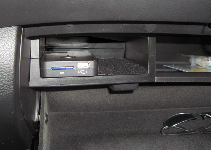 Als Einbauort in meinen Subaru habe ich das kleine Fach links oben im Handschuhfach gewählt. Dieses kleine rechteckige Teil lässt sich herausnehmen und man kann für die Kabeldurchführung ein passendes Loch hineinbohren. Ein kleiner angenieteter ALU-Winkel sorgt dafür, dass das Gerät nicht verutscht.